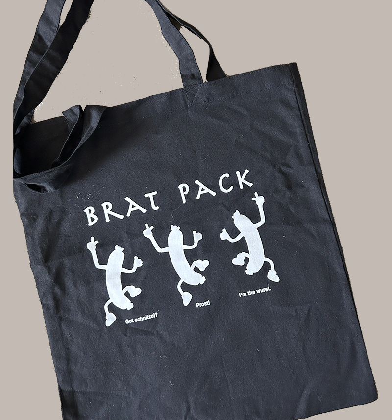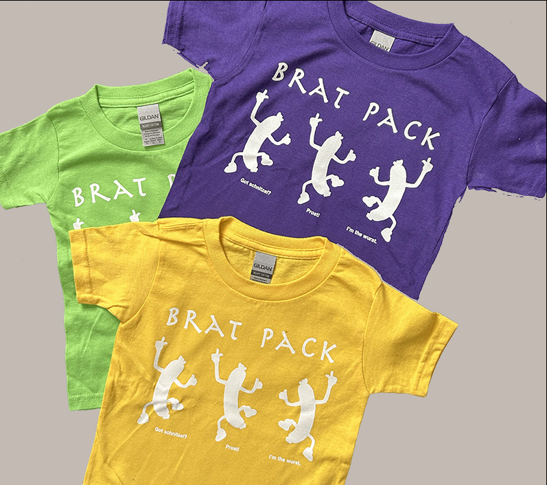 These BRAT PACK t-shirts were created for an Oktoberfest event. They feature three dancing bratwursts with captions: "Got schnitzel?" "Prost!" and "I'm the wurst". The design is still available in toddler, youth, and adult sizes.