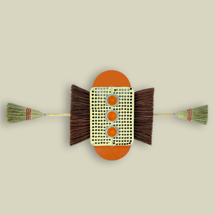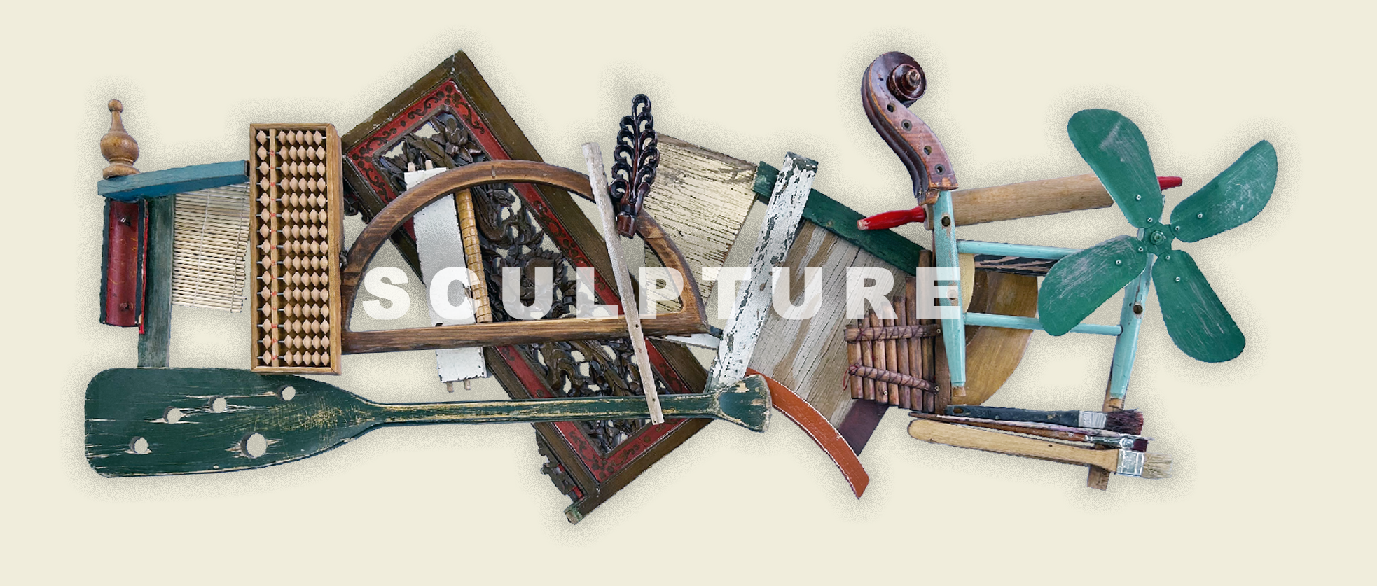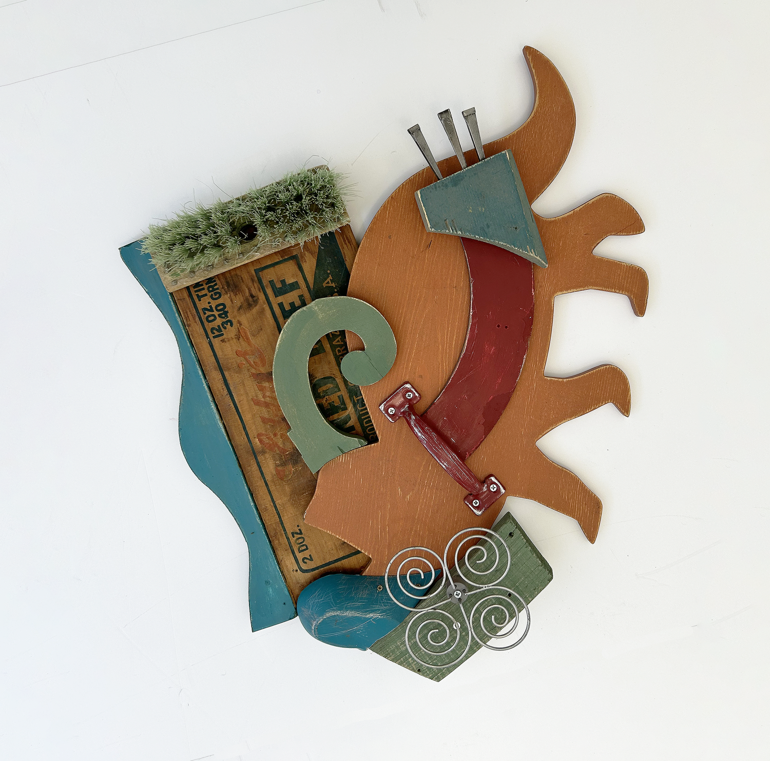 “Aqua Fitness” is a series of wall-mounted assemblage sculptures that evolved from a discarded headboard, in conversation with other lost-and-found items. You will notice references to water-based activities, like oars and boat shapes. Musical instruments also play a part, contributing to the lyrical spirit of these unique sculptures.