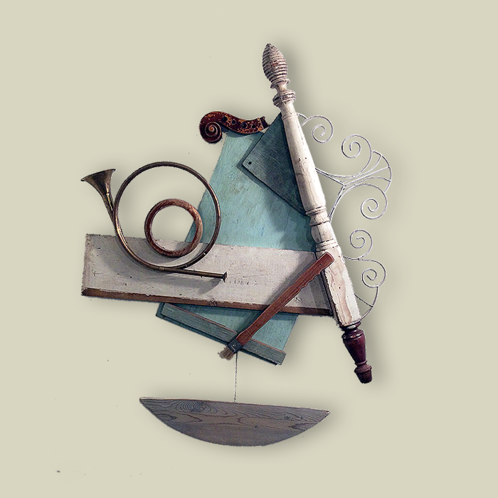 wood and metal assemblage incl. wood scrap, headboard, horn, cello scroll.