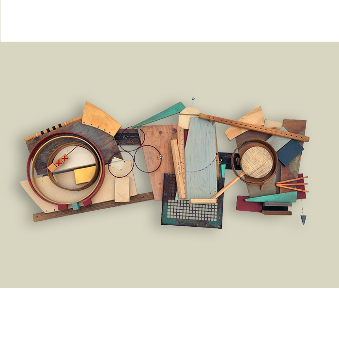 assemblage wall sculpture incl. wood and metal scrap, embroidery hoops, rulers, grate, fishing weight, children’s blocks, monkey drum, crochet post