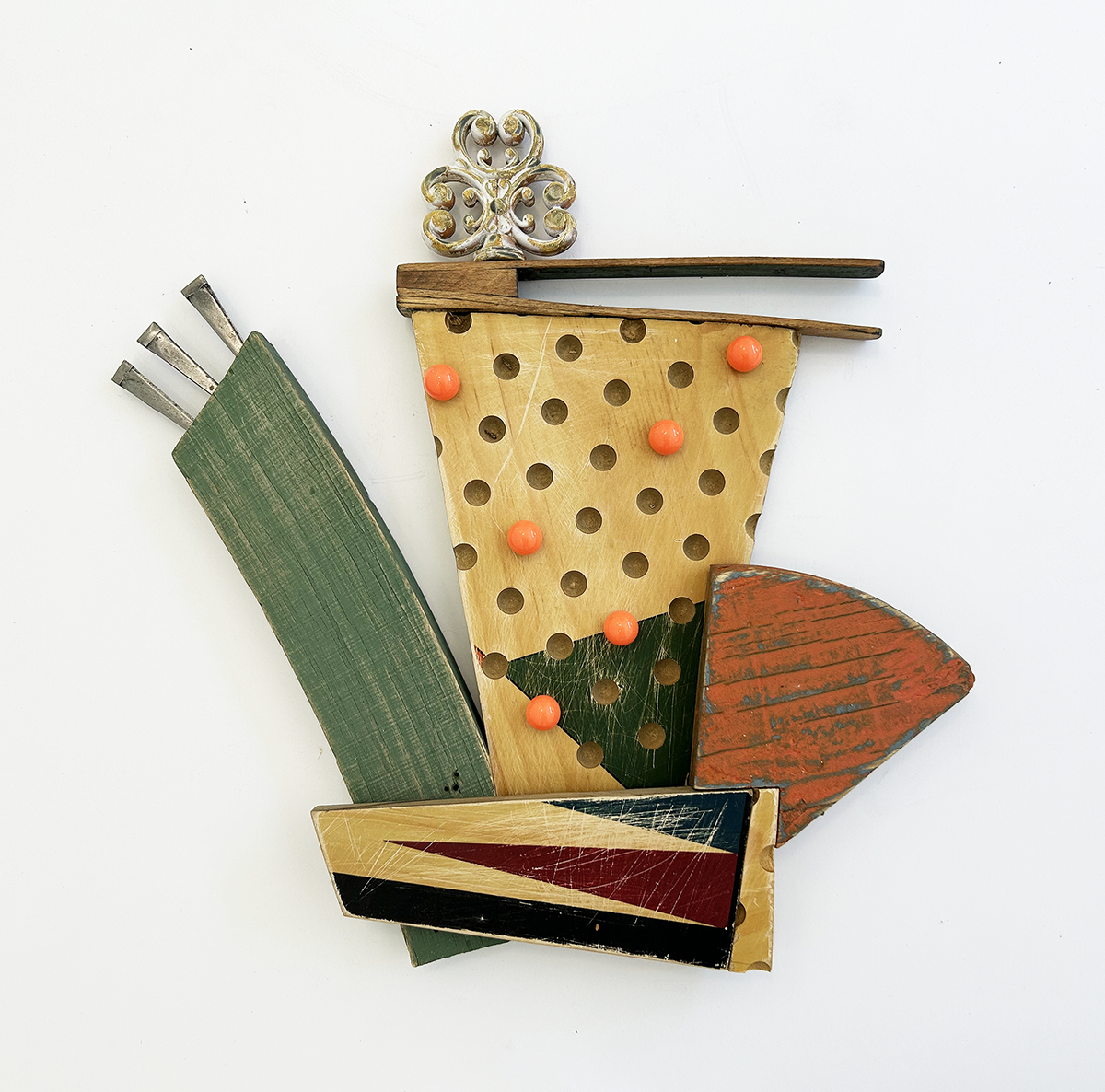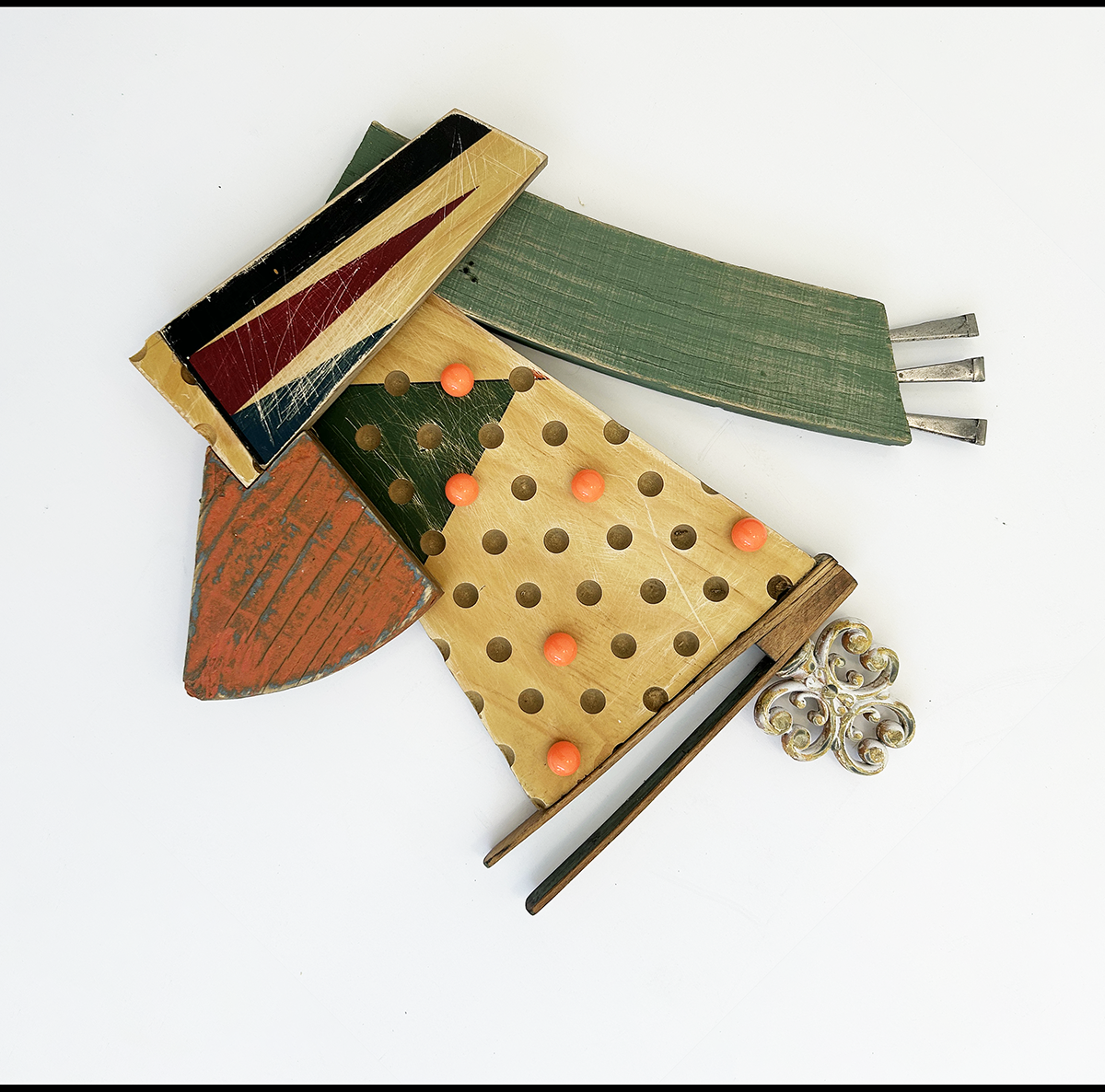 Repurposed wood and metal components, including Chinese checkers game board, Chinese checkers marbles, backgammon board, wood scrap, steel nails, tongs, iron decorative piece.