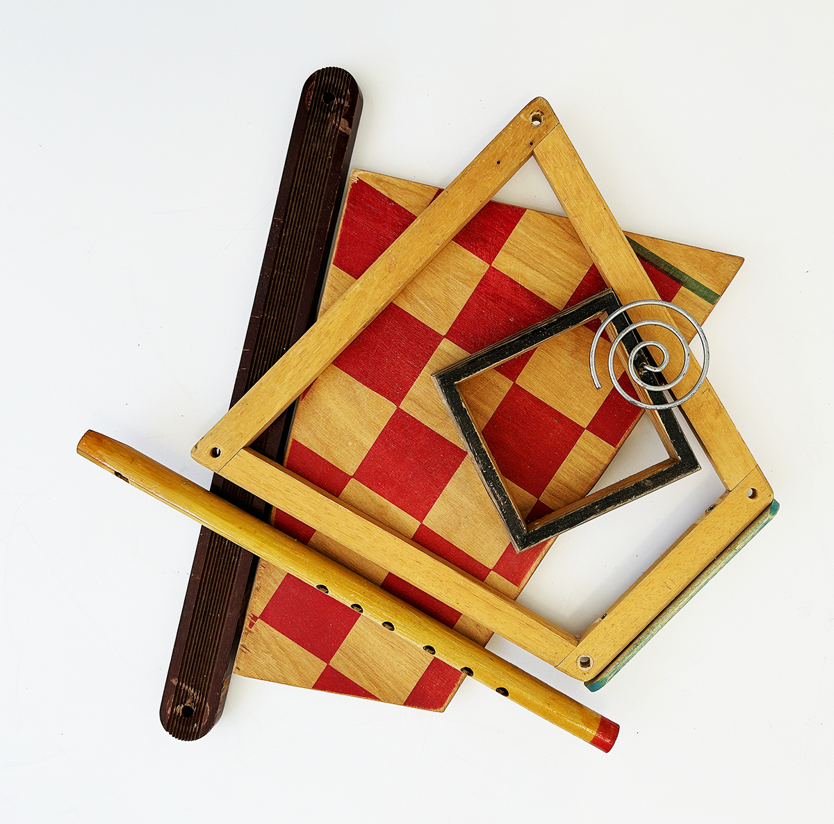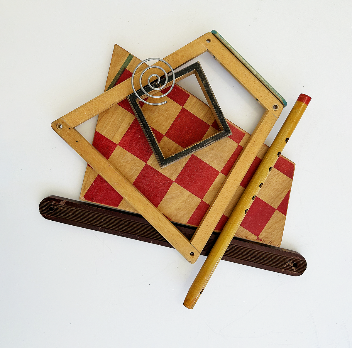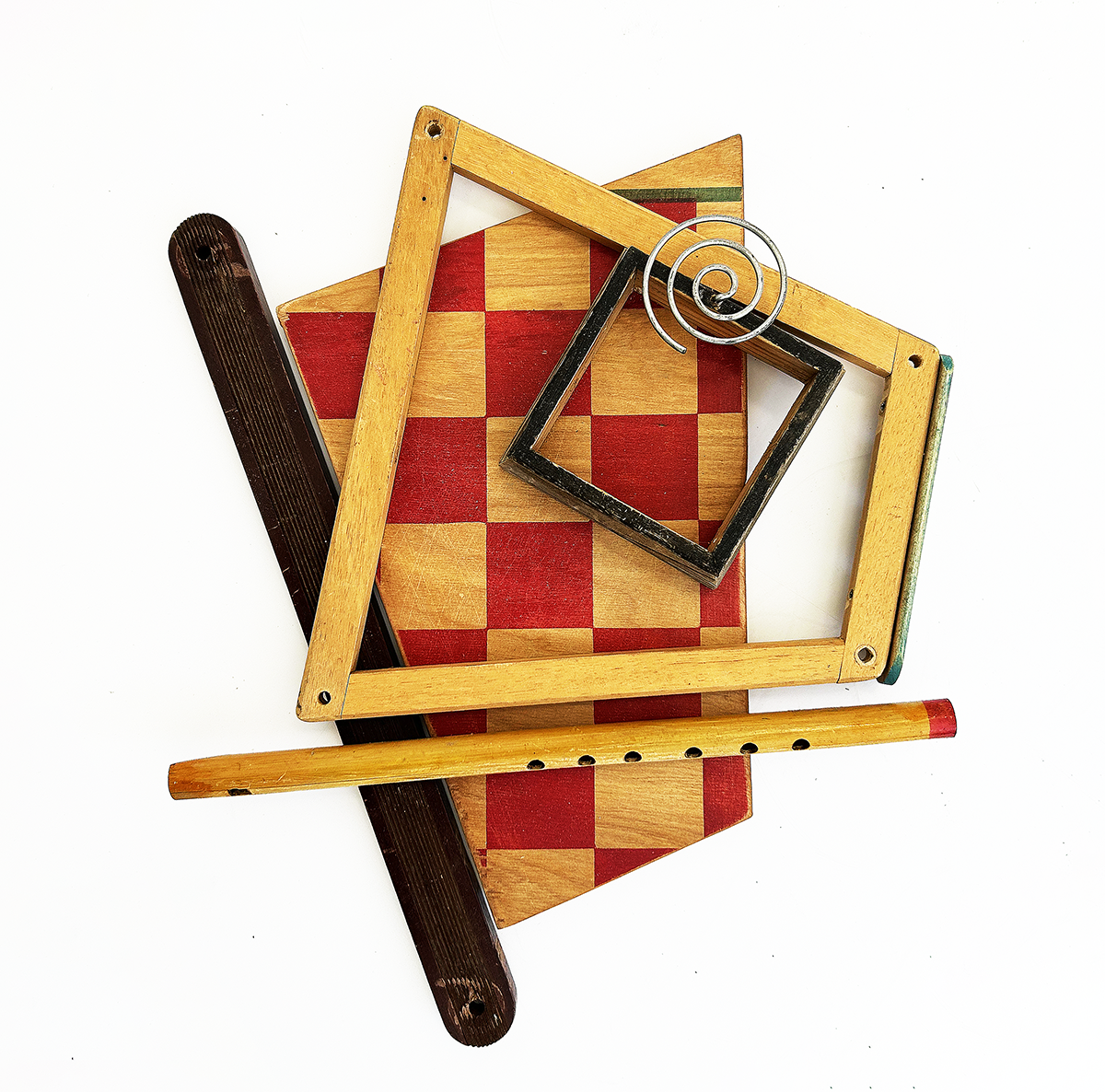 Repurposed wood and metal components, including flute, game board, tennis racquet protector, small frame, misc doo-dads.