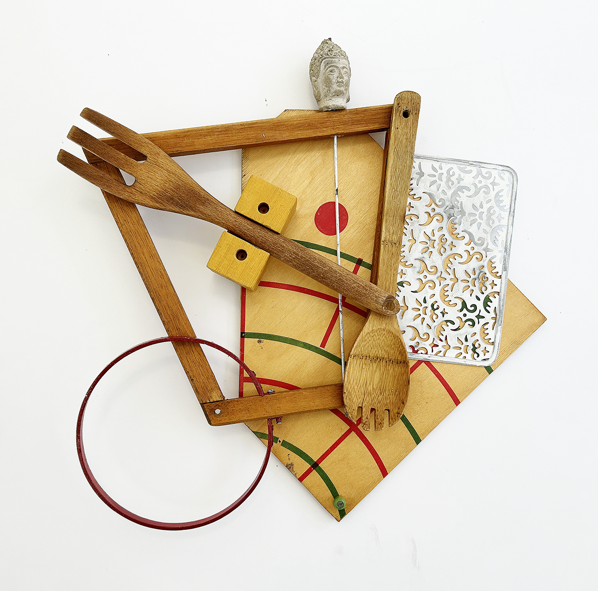 Repurposed wood, metal, and plaster components, including game board, embroidery hoop, salad forks, metal grill, garden stake.