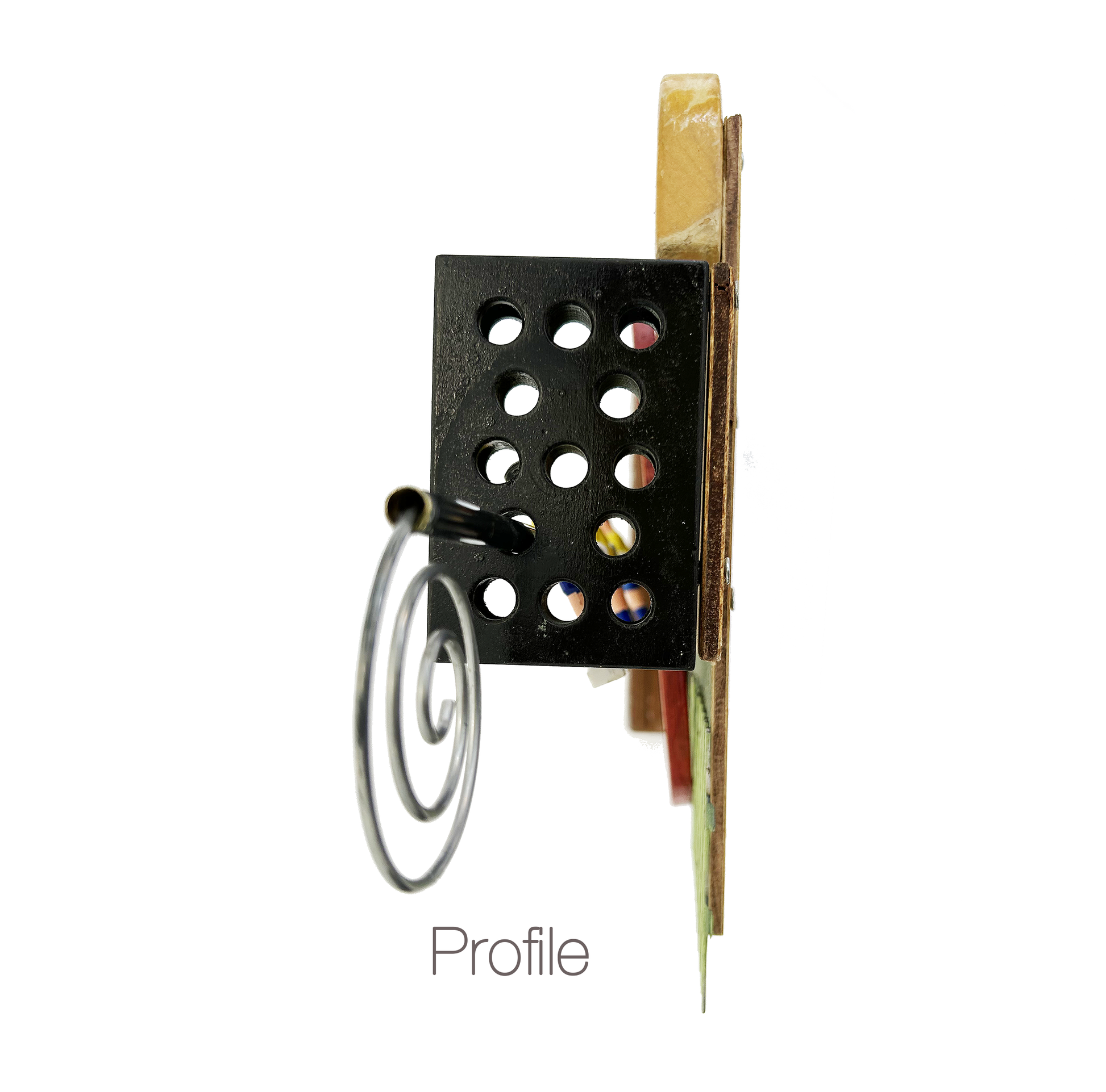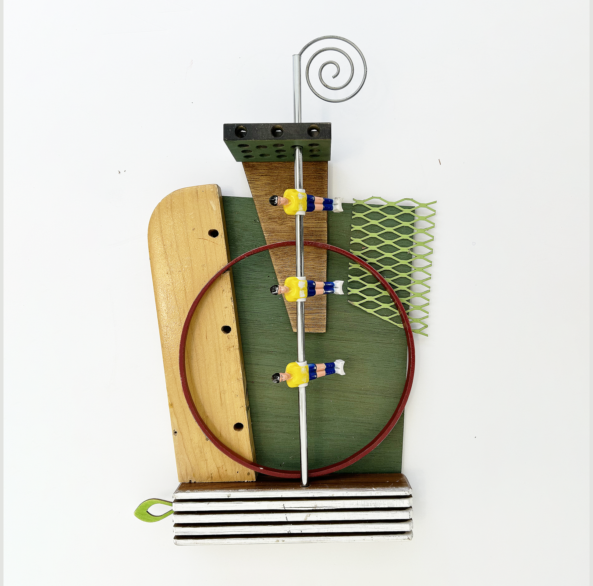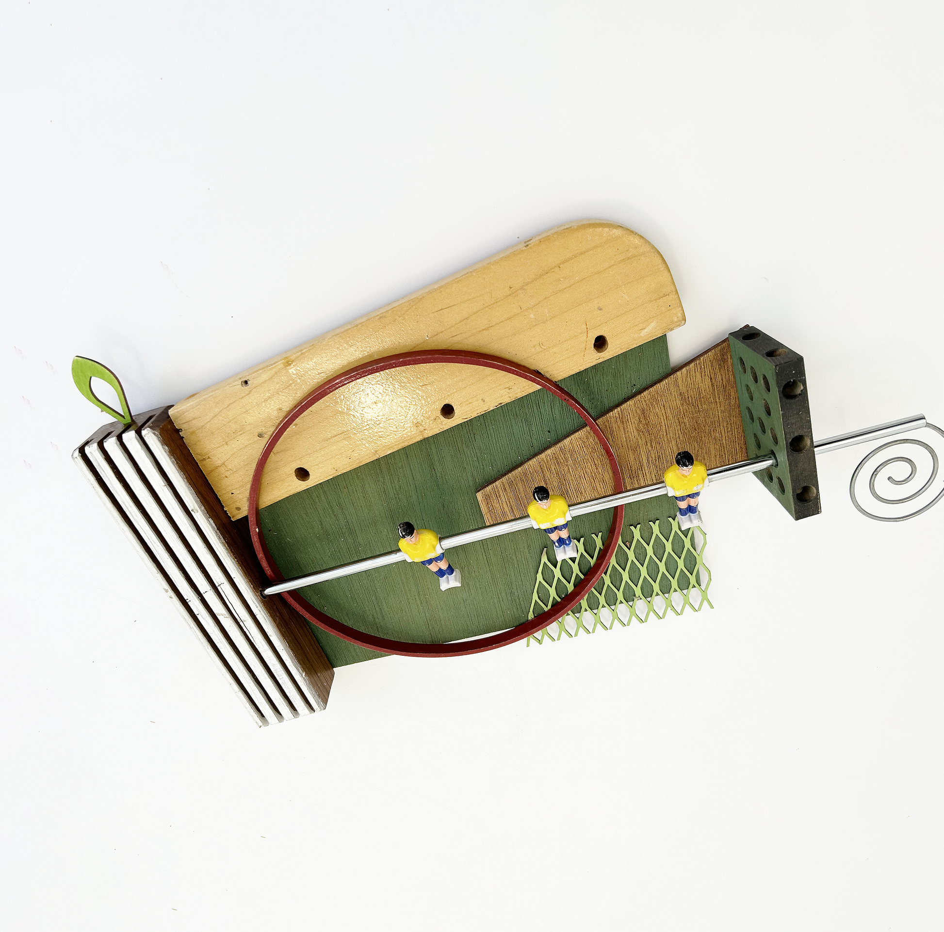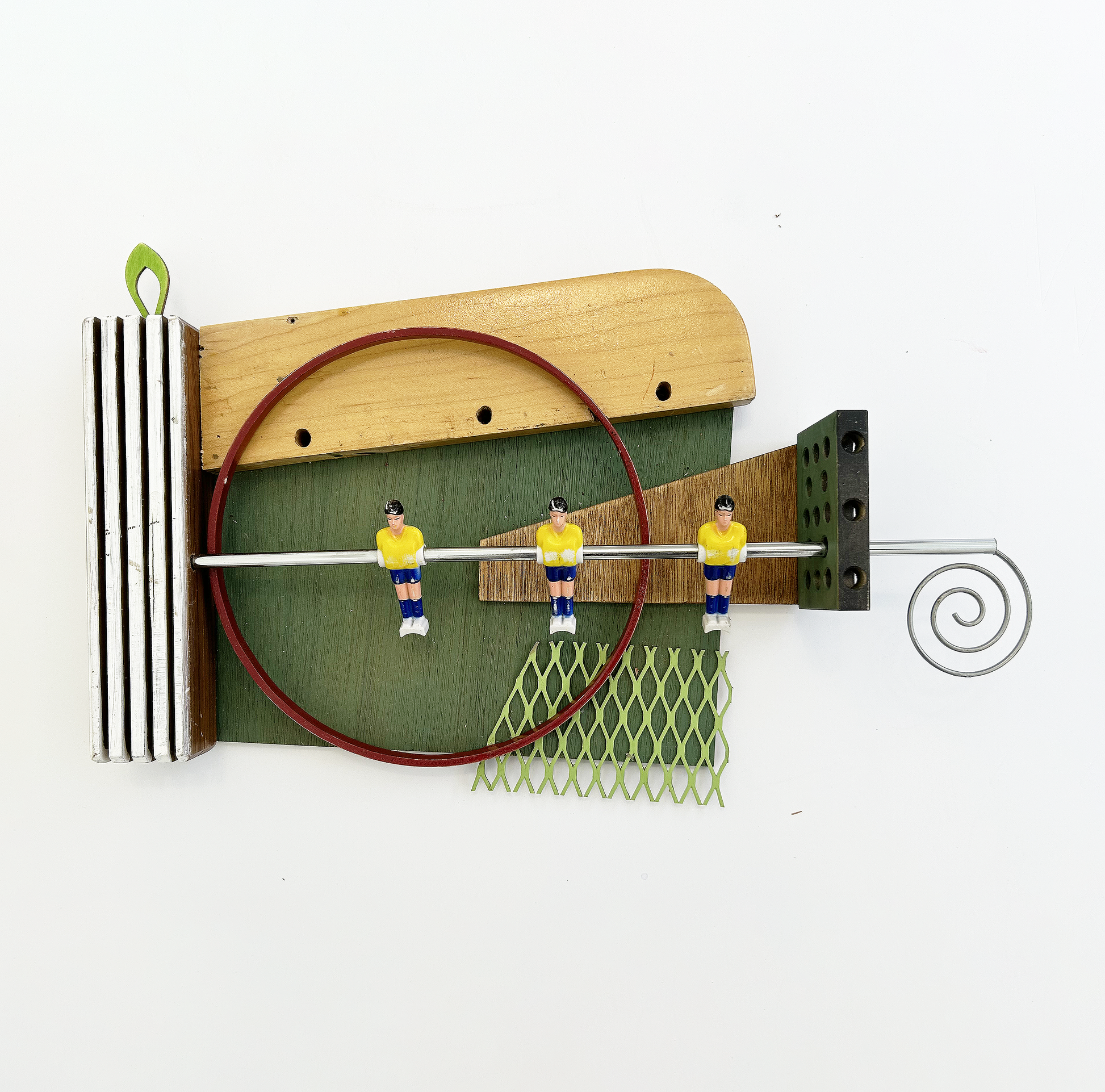 Repurposed wood, plastic, and metal components, including foosball part, unidentified wood scraps, expanded iron, earring part, embroidery hoop.