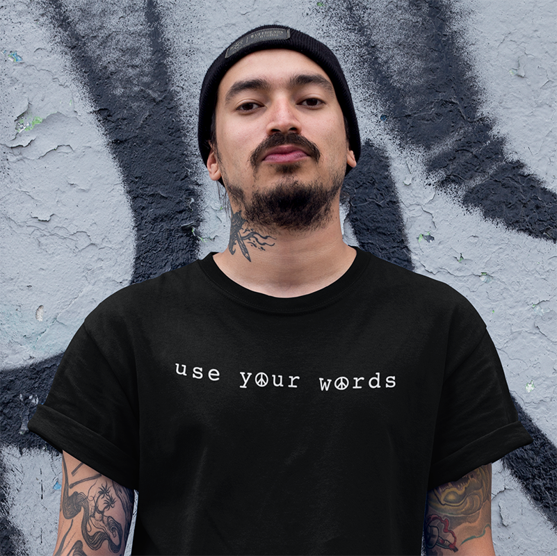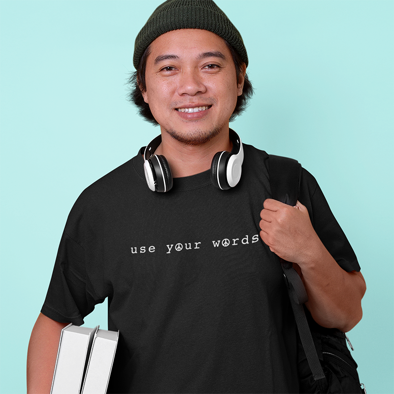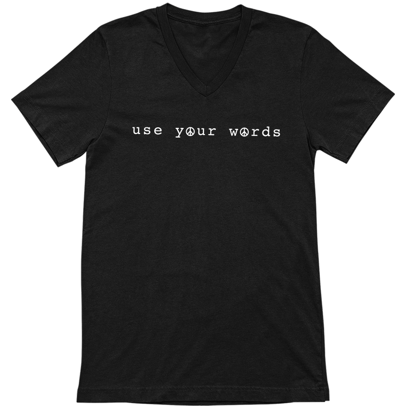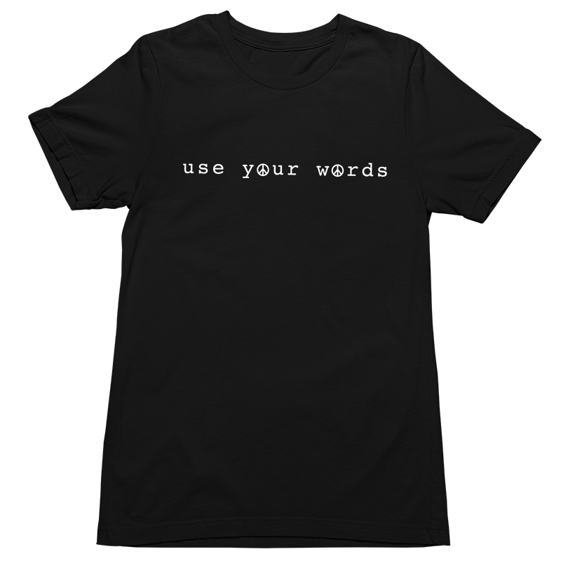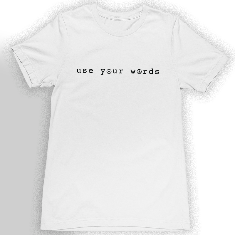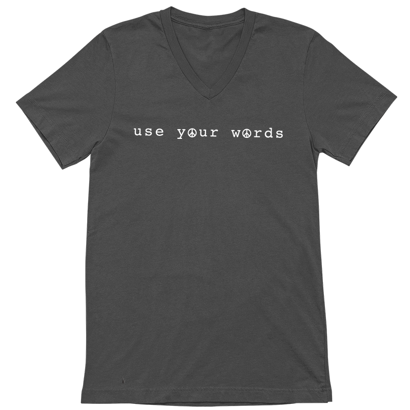 Promote peace with subtle text-based screen-printed graphic T-shirt design. Smart, cool, comfy, gift for adults, children, and world-leaders. Choose from white, asphalt, or black shirts; crew neck or V-neck. 100% airlume cotton fabric, comfortable, breathable.