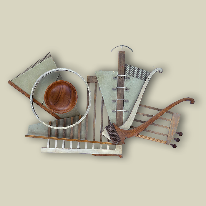 wood and metal assemblage incl. drawer pulls, table legs, instrument scrolls, hoop, salad bowl. SOLD