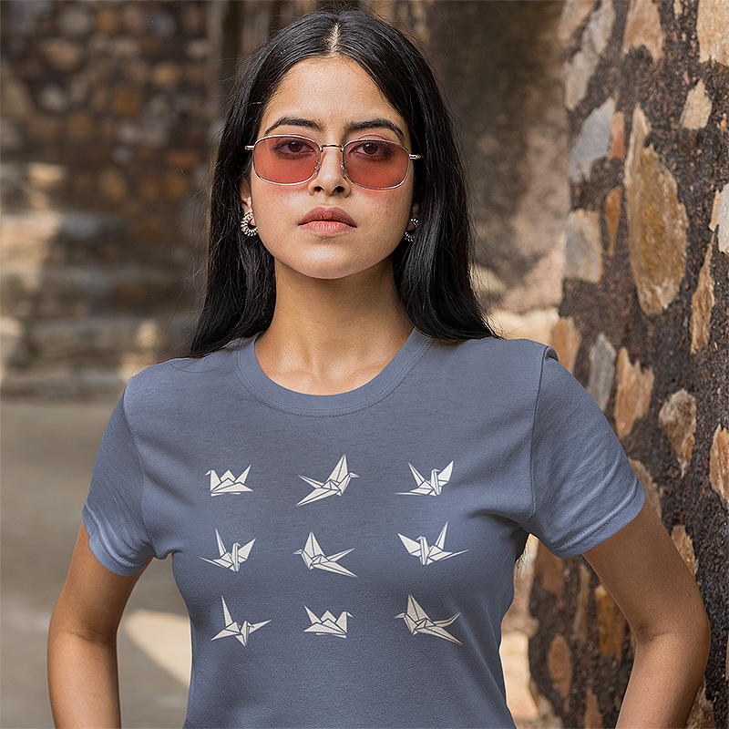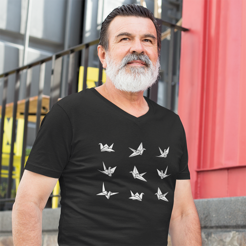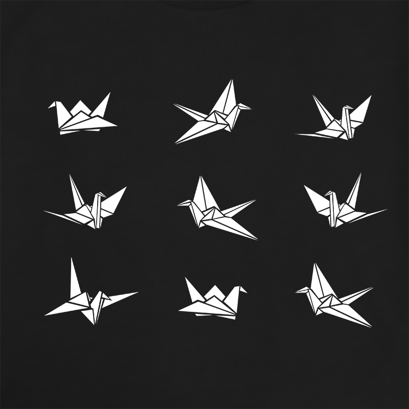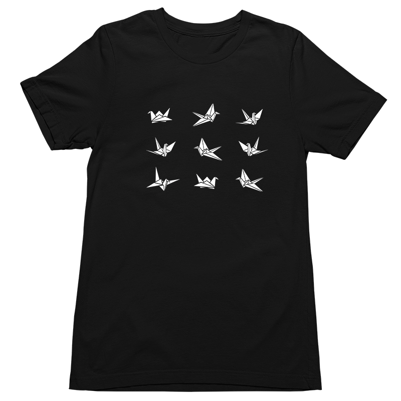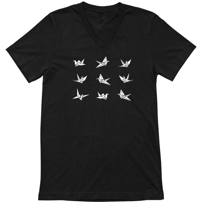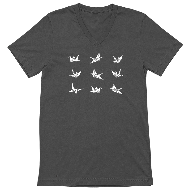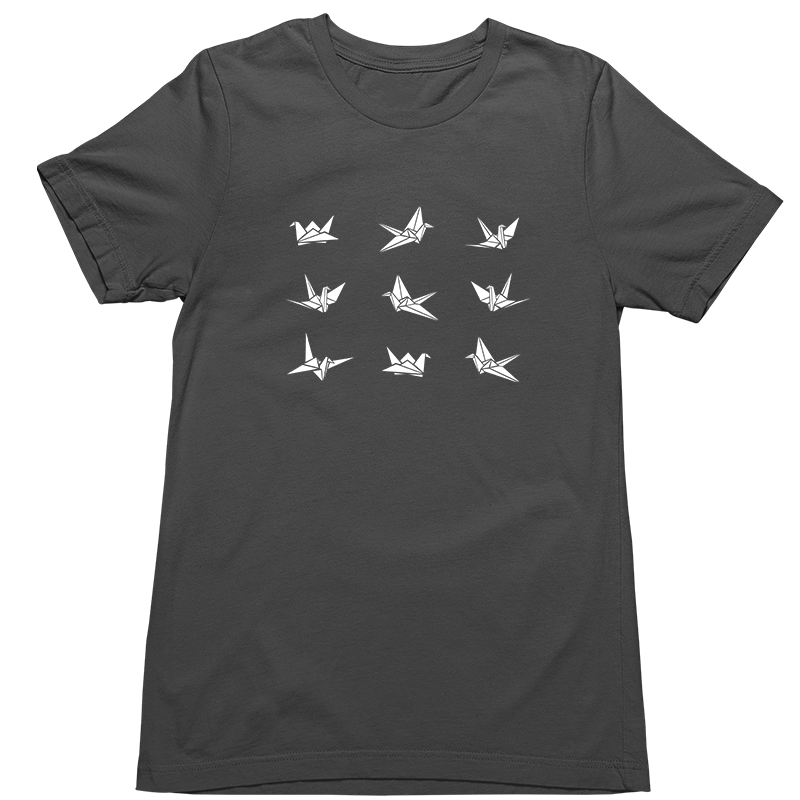 Japanese origami cranes tshirt. Grid pattern, screen printed graphic line art. Classy, soft, comfy, gift for adults and youth. Asian themed. Choose from white, asphalt, or black shirts; crew neck or V-neck. 100% airlume cotton fabric, comfortable, breathable.