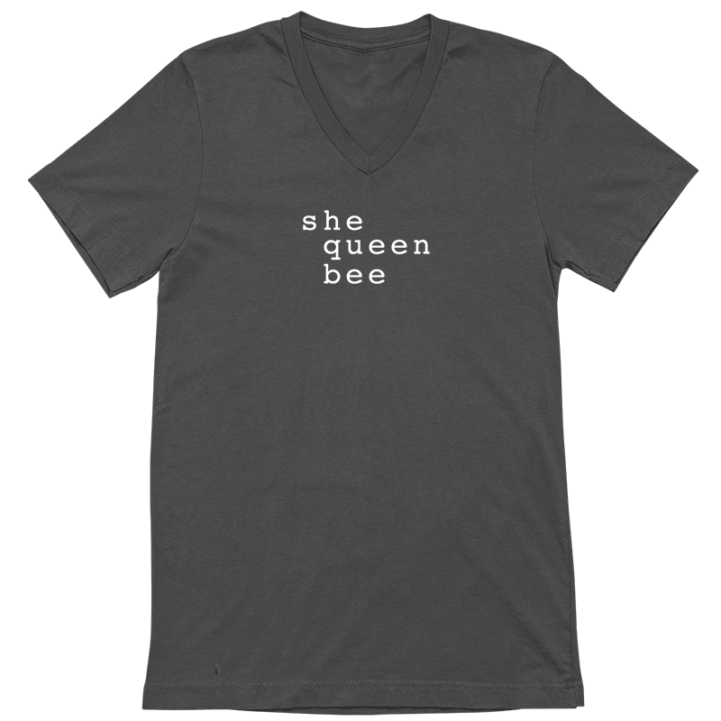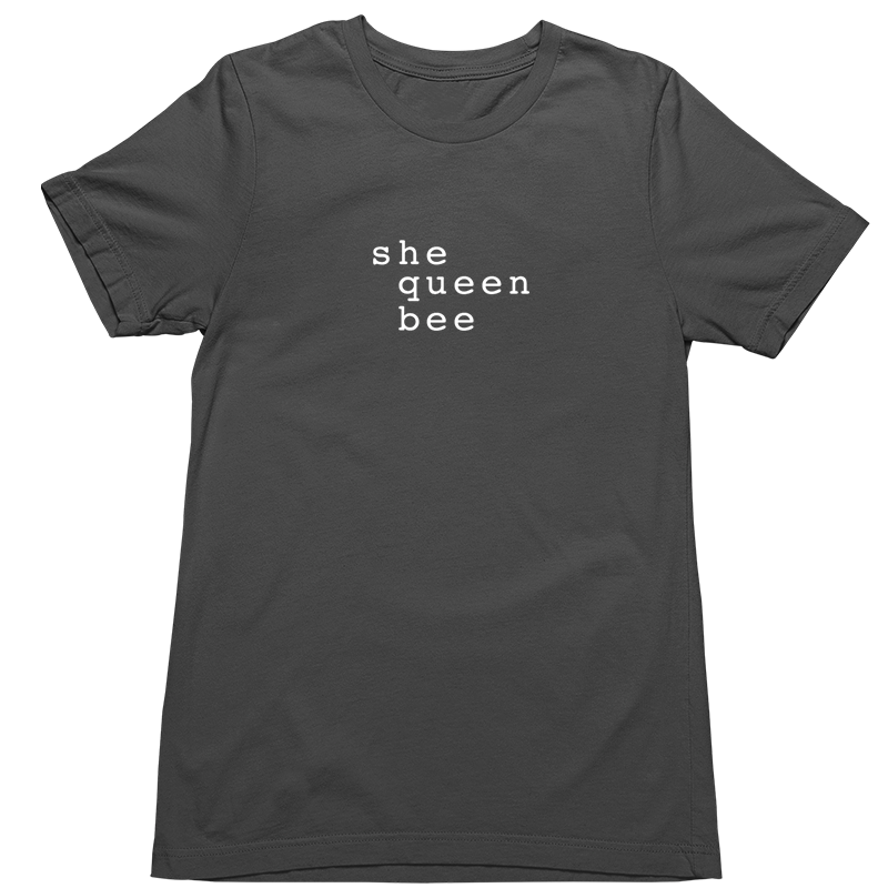Humorous tshirt with text-based queen bee message screen-printed graphic tshirt design for strong women. Sassy, funny, text-based, comfy. Choose from white, asphalt, or black shirts; crew neck or V-neck. 100% airlume cotton fabric, comfortable, breathable.