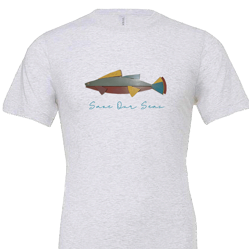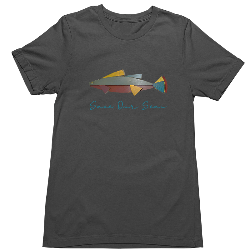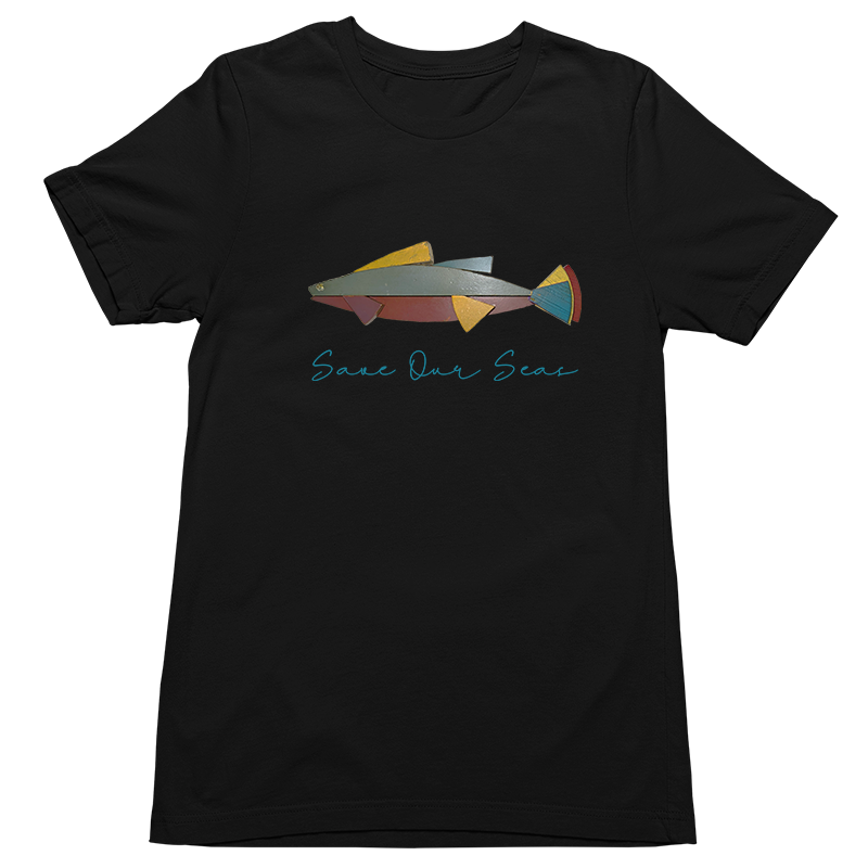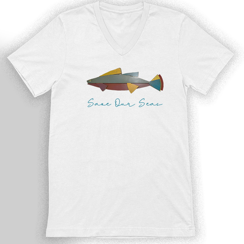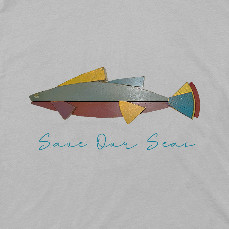 Save Our Seas. Wear this environmentally conscious message, featuring an assemblage fish sculpture image (titled "Turn It Around") by Deborah Jang.