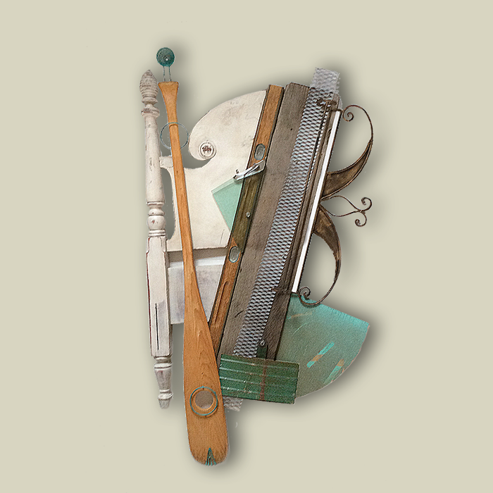 wood and metal assemblage incl. headboard, oar, level, hose hanger, car window.