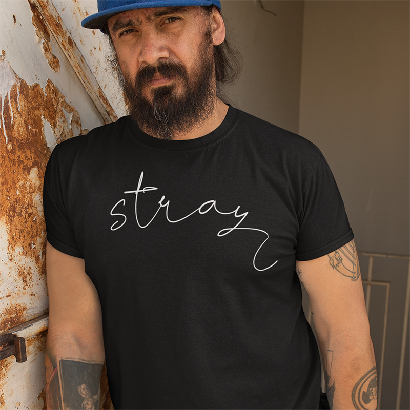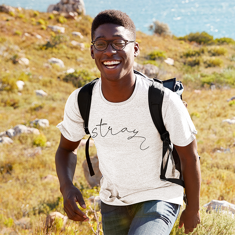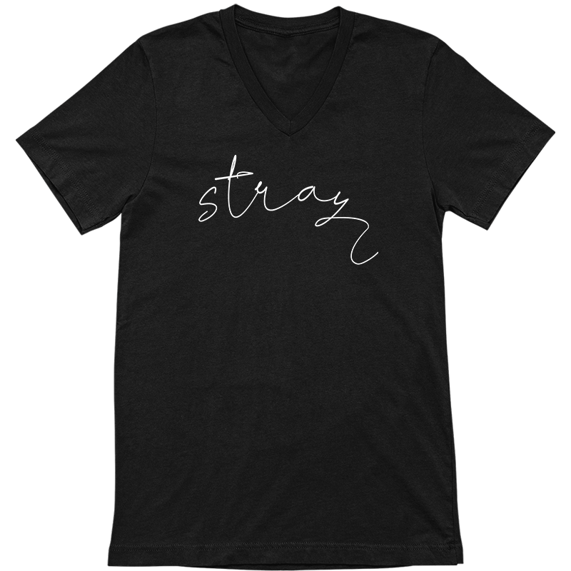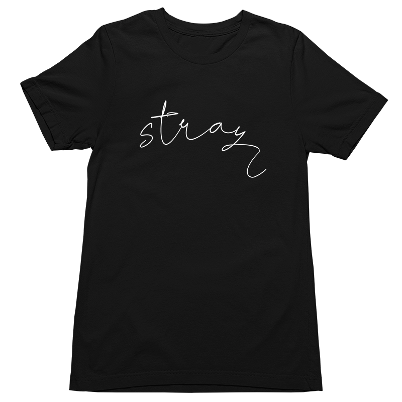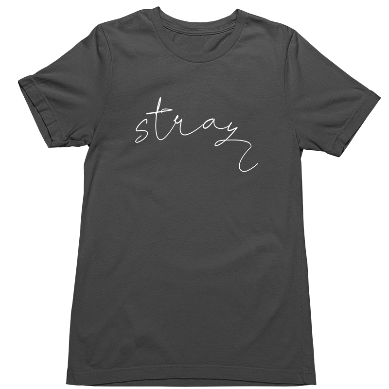 Elegant text-based tshirt with script design. STRAY, explore, wander off course happily. Adventure awaits in your classy shirt. Choose from white, asphalt, or black shirts; crew neck or V-neck. 100% airlume cotton fabric, comfortable, breathable.