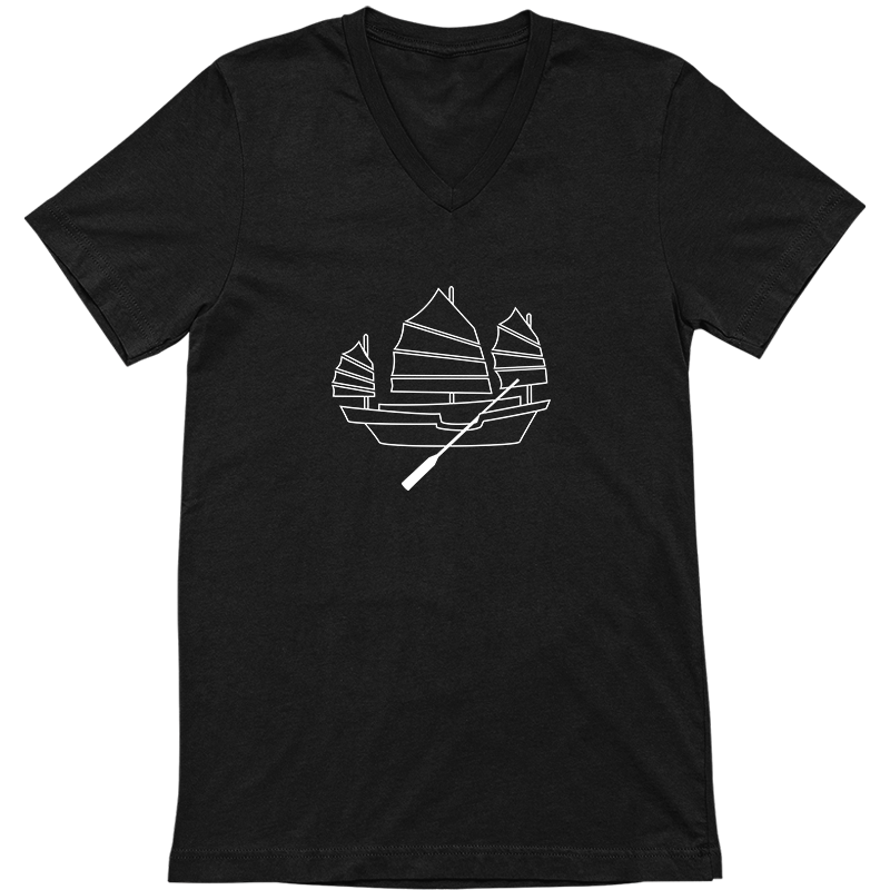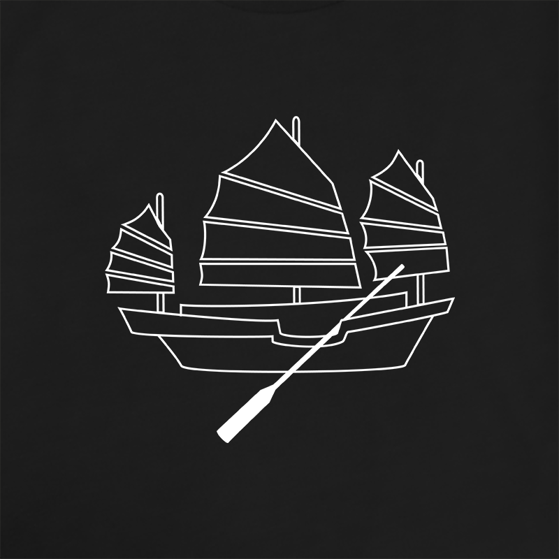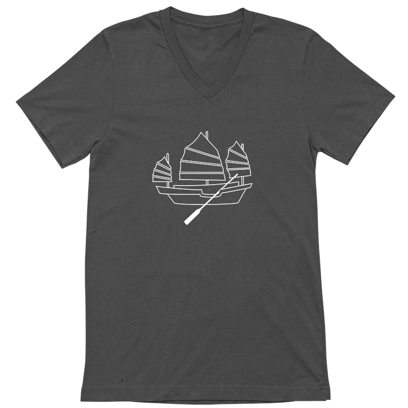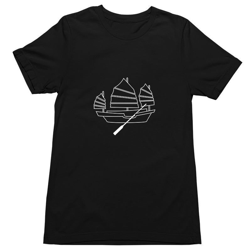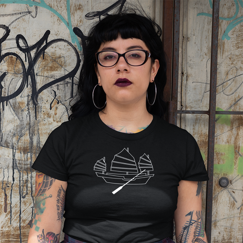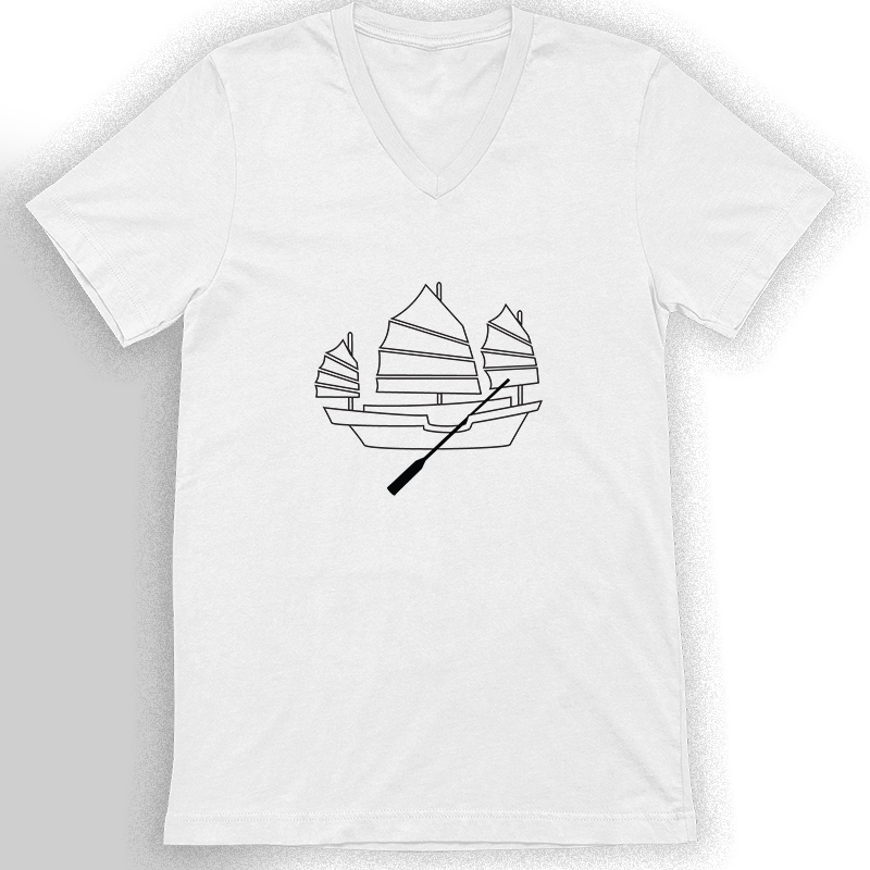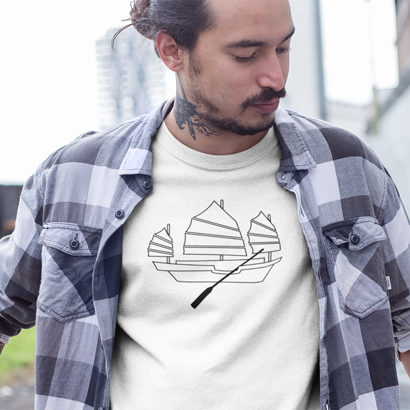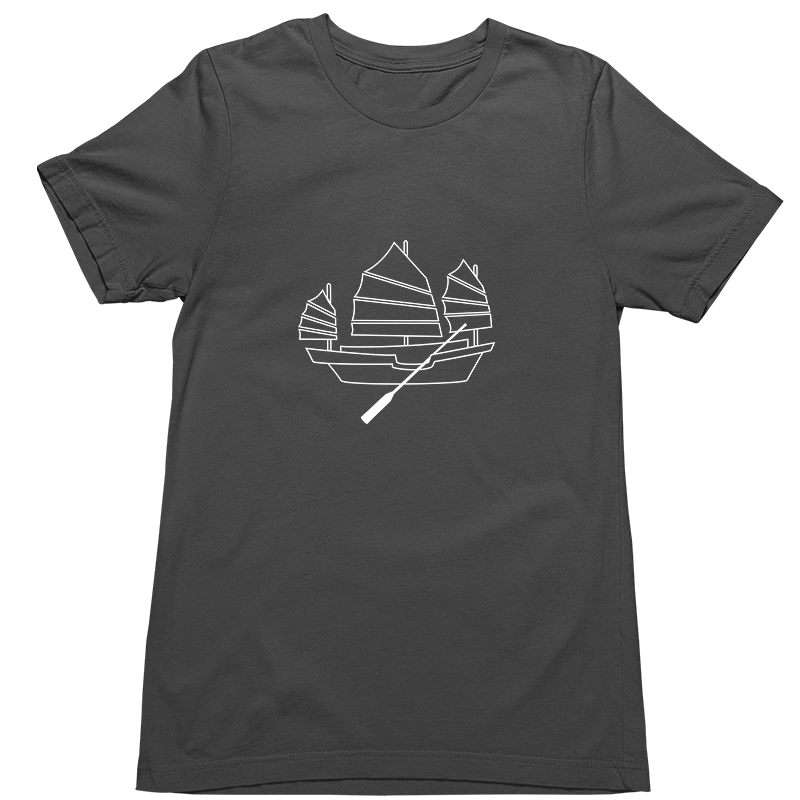 Tshirt with Chinese junk boat screen-printed graphic line art design. Smart, cool, fun, Asian motif, comfy, gift. Choose from white, asphalt, or black shirts; crew neck or V-neck. 100% airlume cotton fabric, comfortable, breathable.