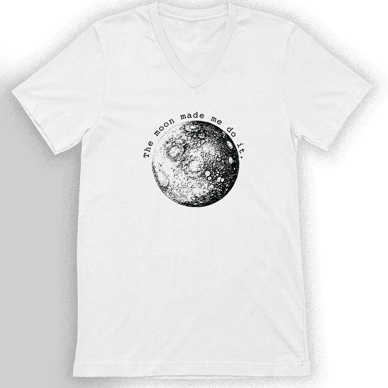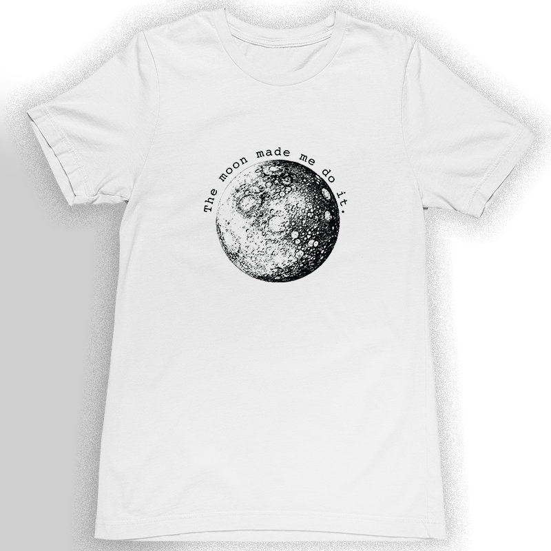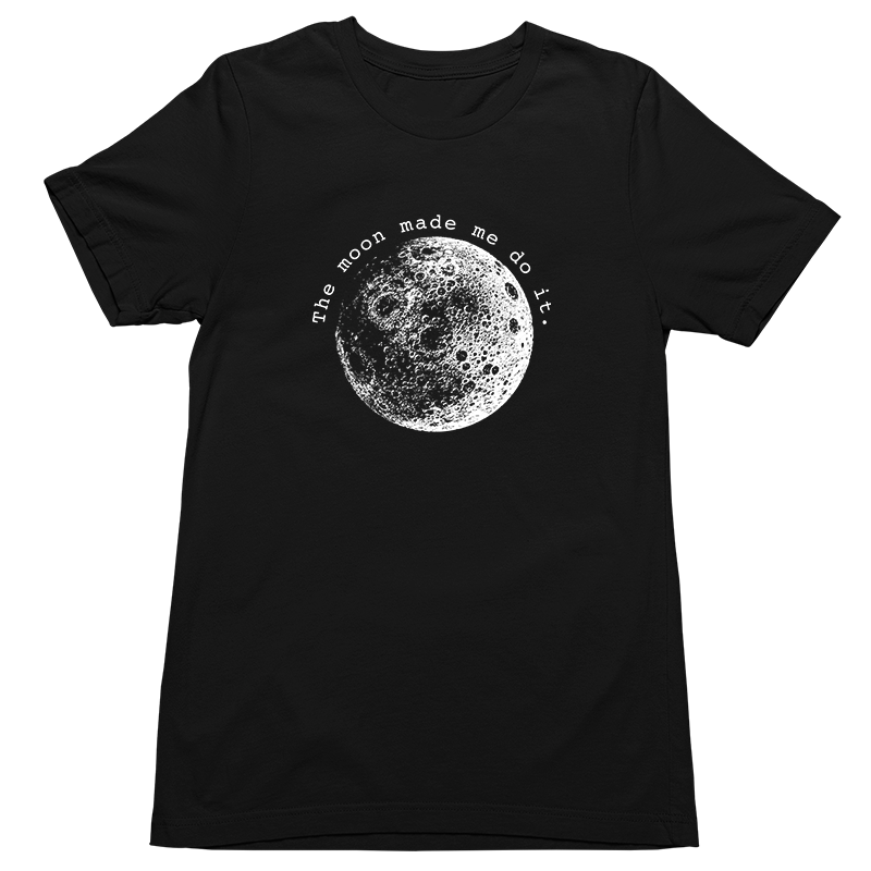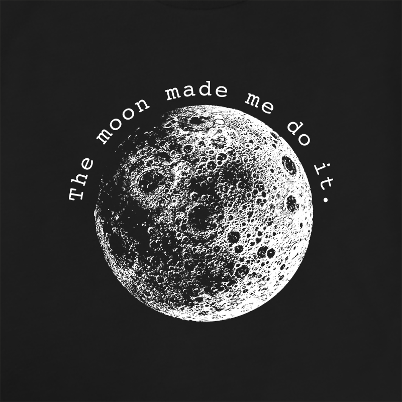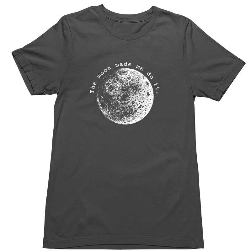 We all experience moments and moods of lunacy. This shirt offers a humorous excuse for our sometimes inexplicable crazy behaviors. Full moon shirt with funny saying. Large cratered moon image uses curved, text-based humor. The moon made me do it!