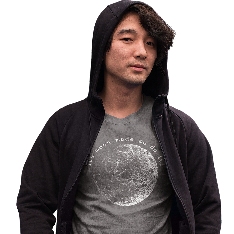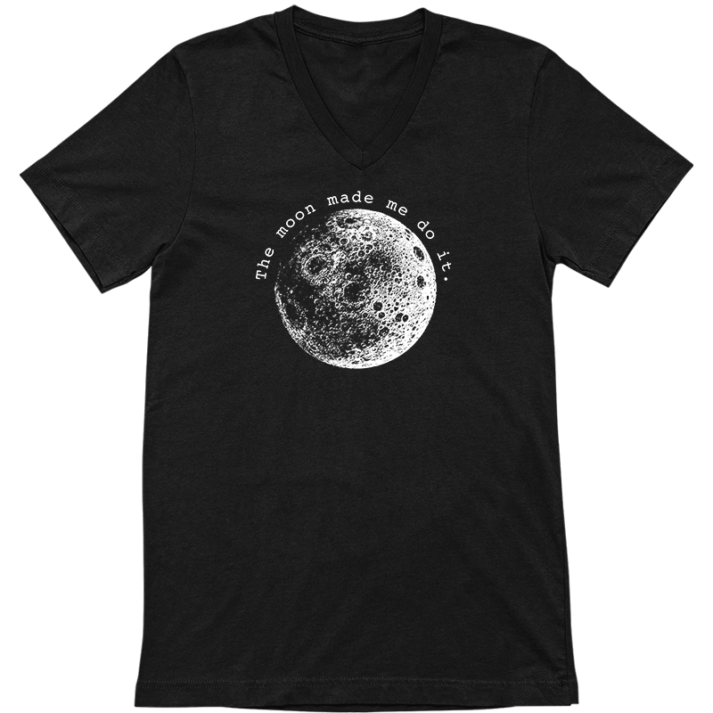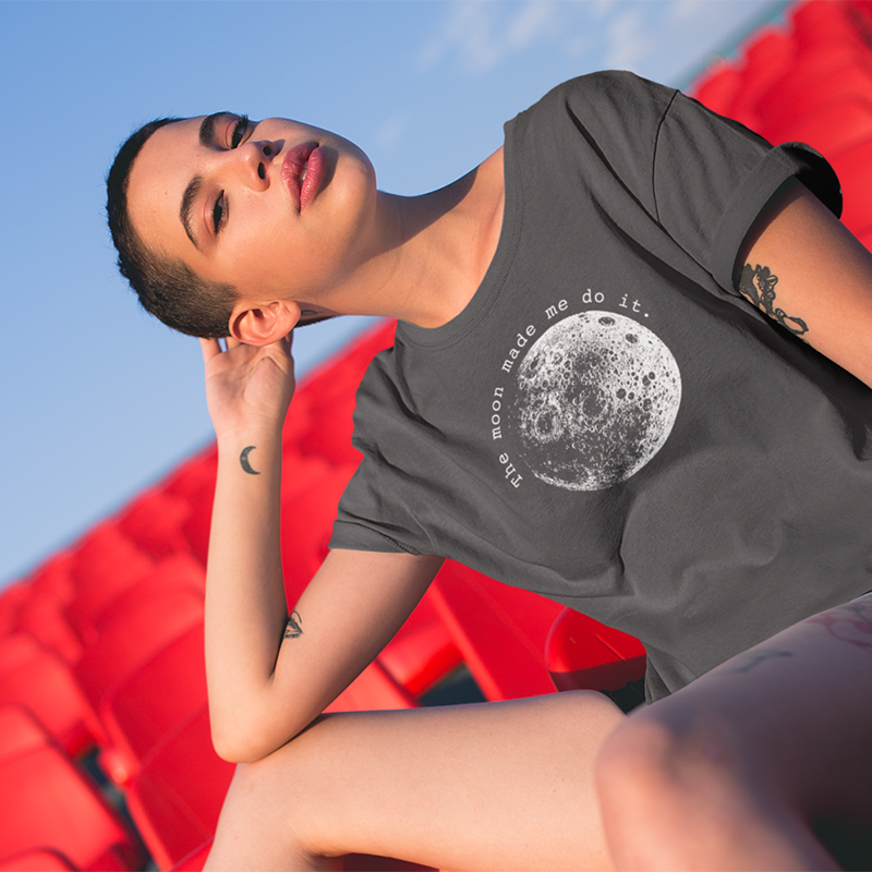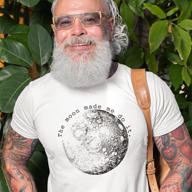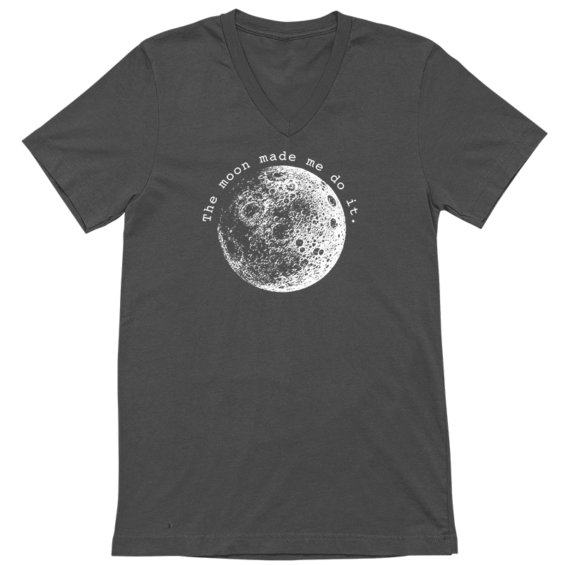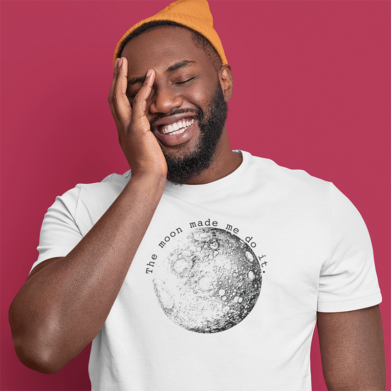 We all experience moments and moods of lunacy. This shirt offers a humorous excuse for our sometimes inexplicable crazy behaviors. Full moon shirt with funny saying. Large cratered moon image uses curved, text-based humor. The moon made me do it!