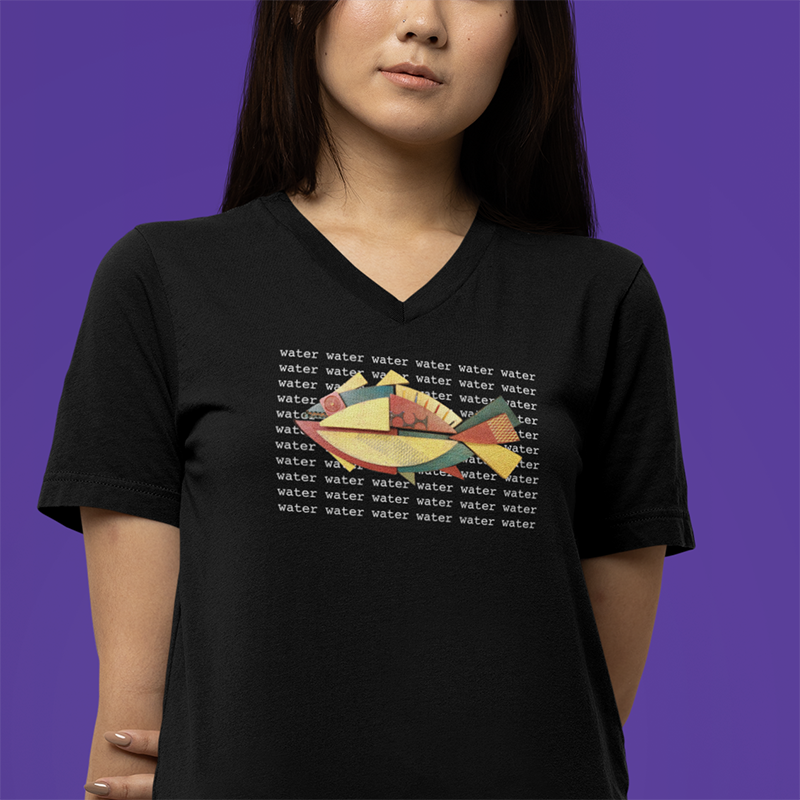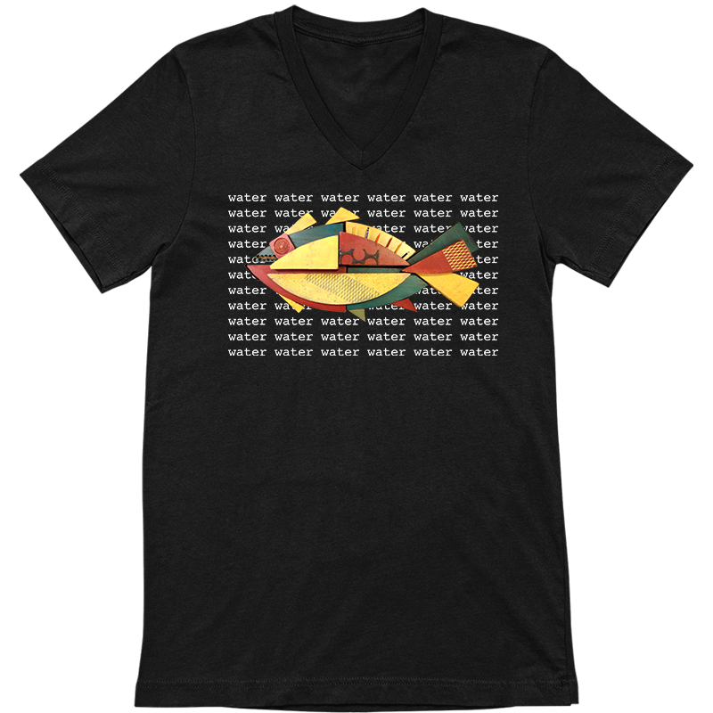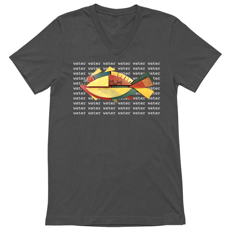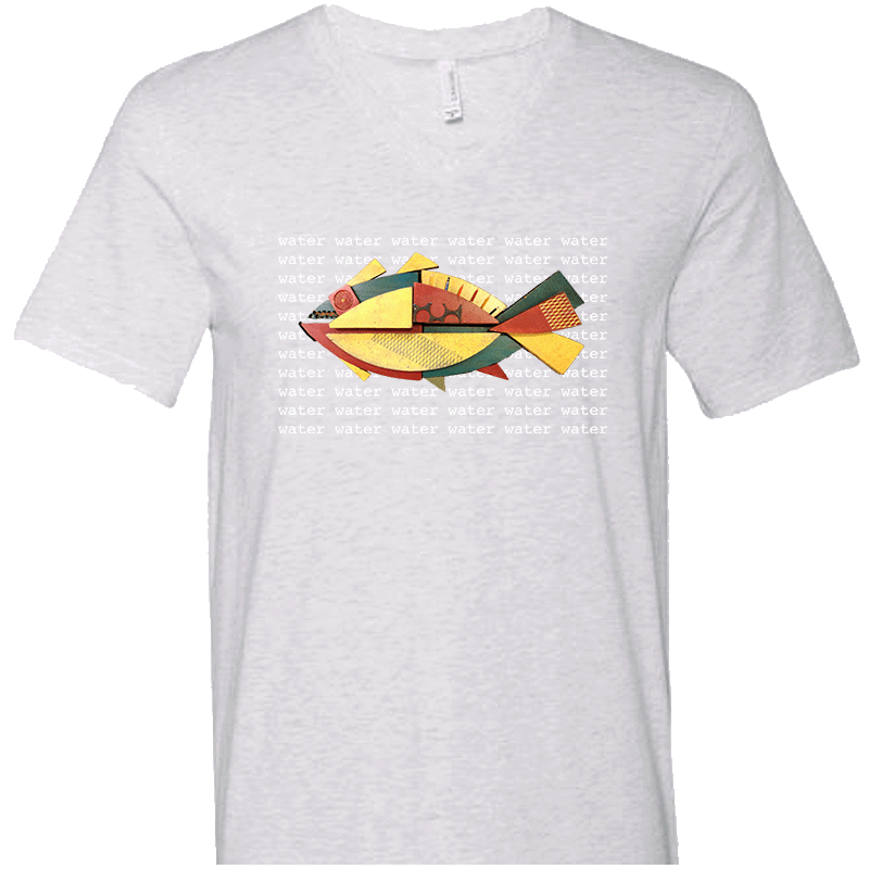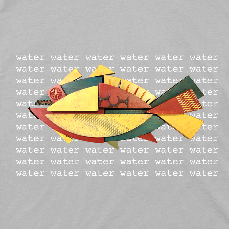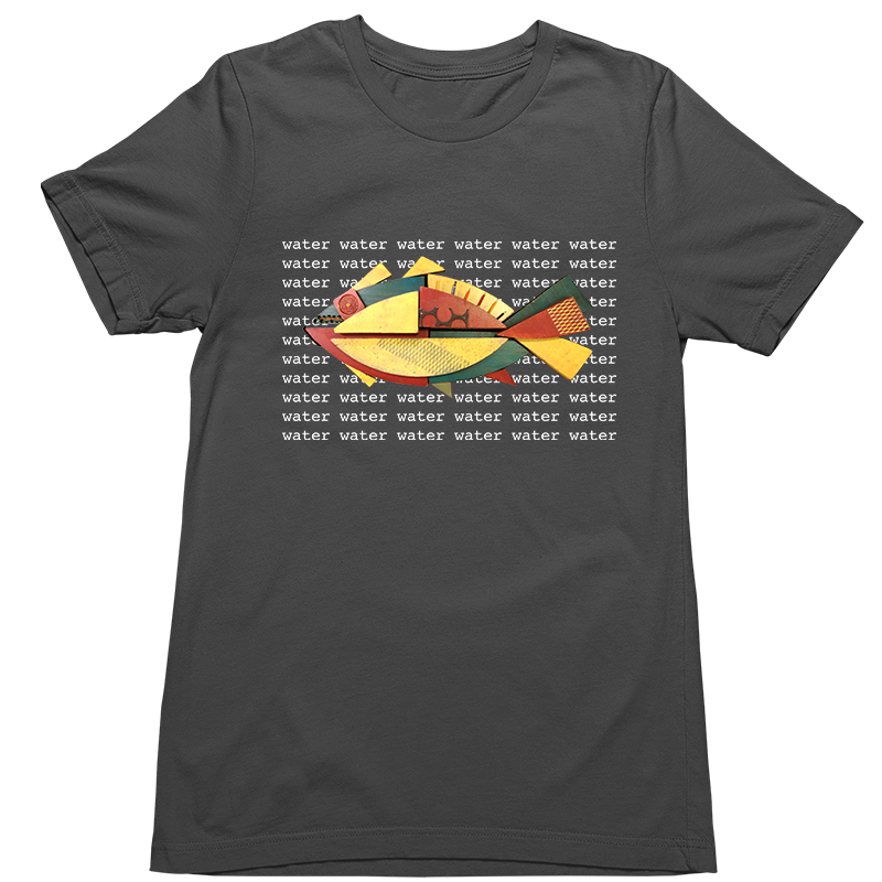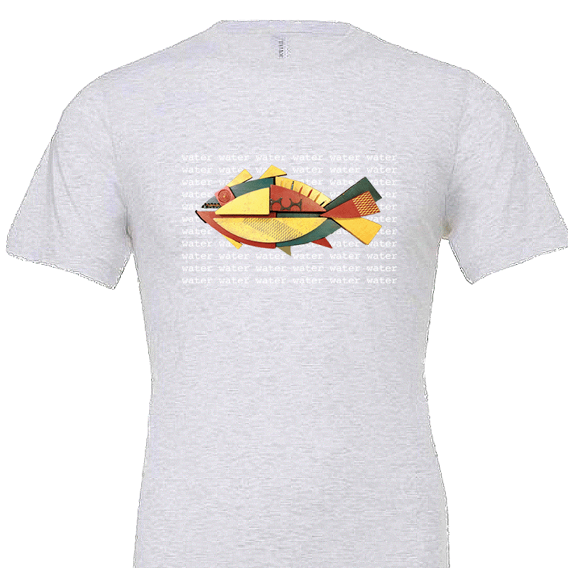 This design image features a fish sculpture by Deborah Jang, and reminds of us our most life-giving resource. Artful shirt with text-based message.